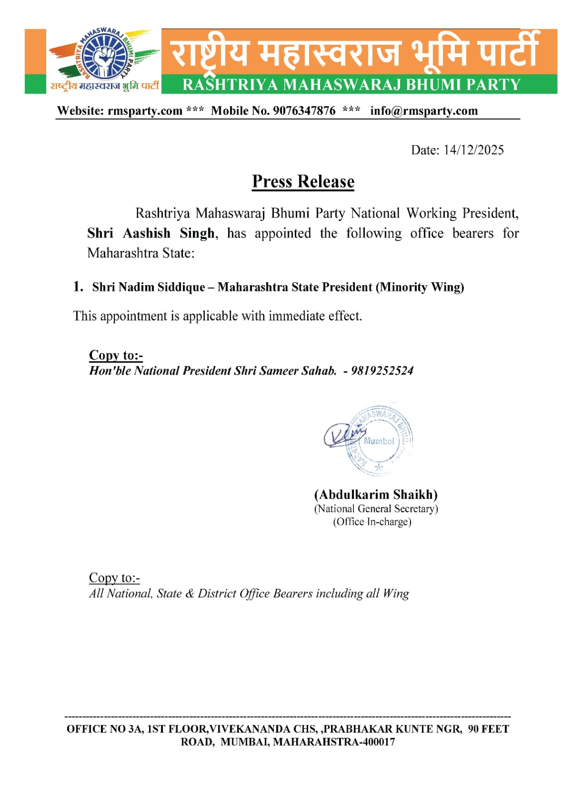 राष्ट्रीय महास्वराज भूमि पार्टी ने अपने संगठनात्मक ढांचे को और अधिक सशक्त एवं प्रभावी बनाने की दिशा में एक महत्वपूर्ण कदम उठाते हुए महाराष्ट्र राज्य के लिए एक अहम नियुक्ति…