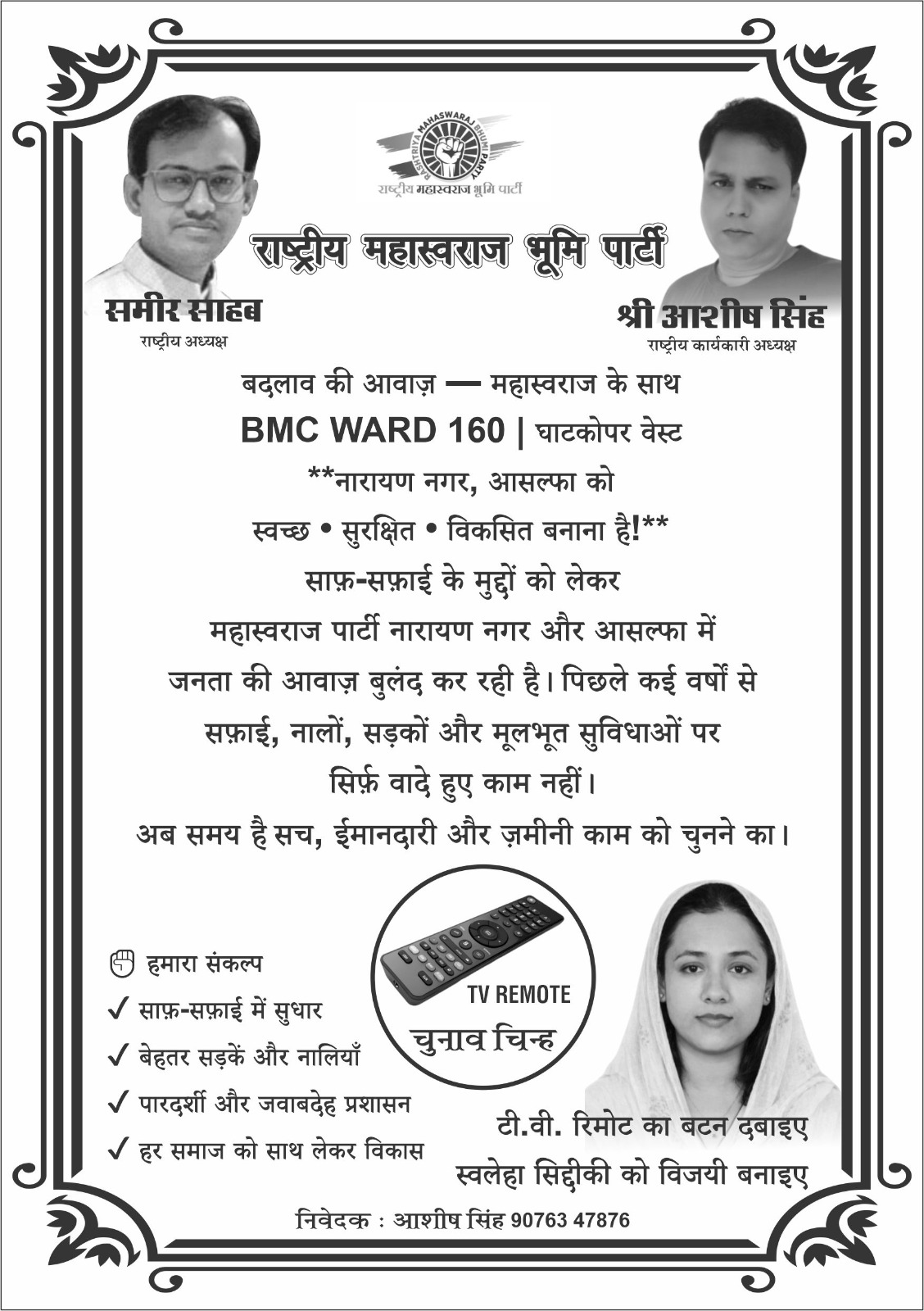 मुंबई | घाटकोपर पश्चिम (नारायण नगर–आसलफ़ा): बृहन्मुंबई महानगरपालिका चुनाव 2026 को लेकर वार्ड 160 में…