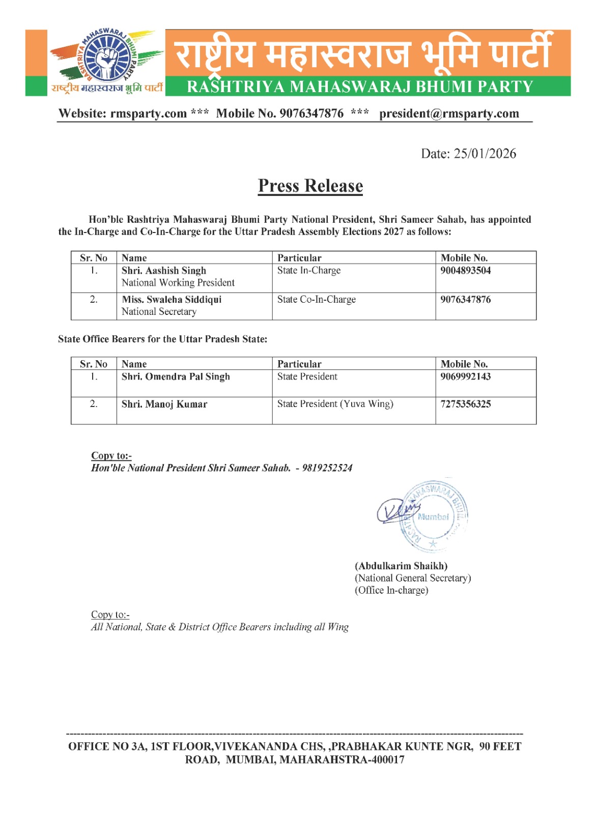 उत्तर प्रदेश विधानसभा चुनाव 2027 को लेकर राष्ट्रीय महास्वराज भूमि पार्टी ने बड़ा और स्पष्ट…