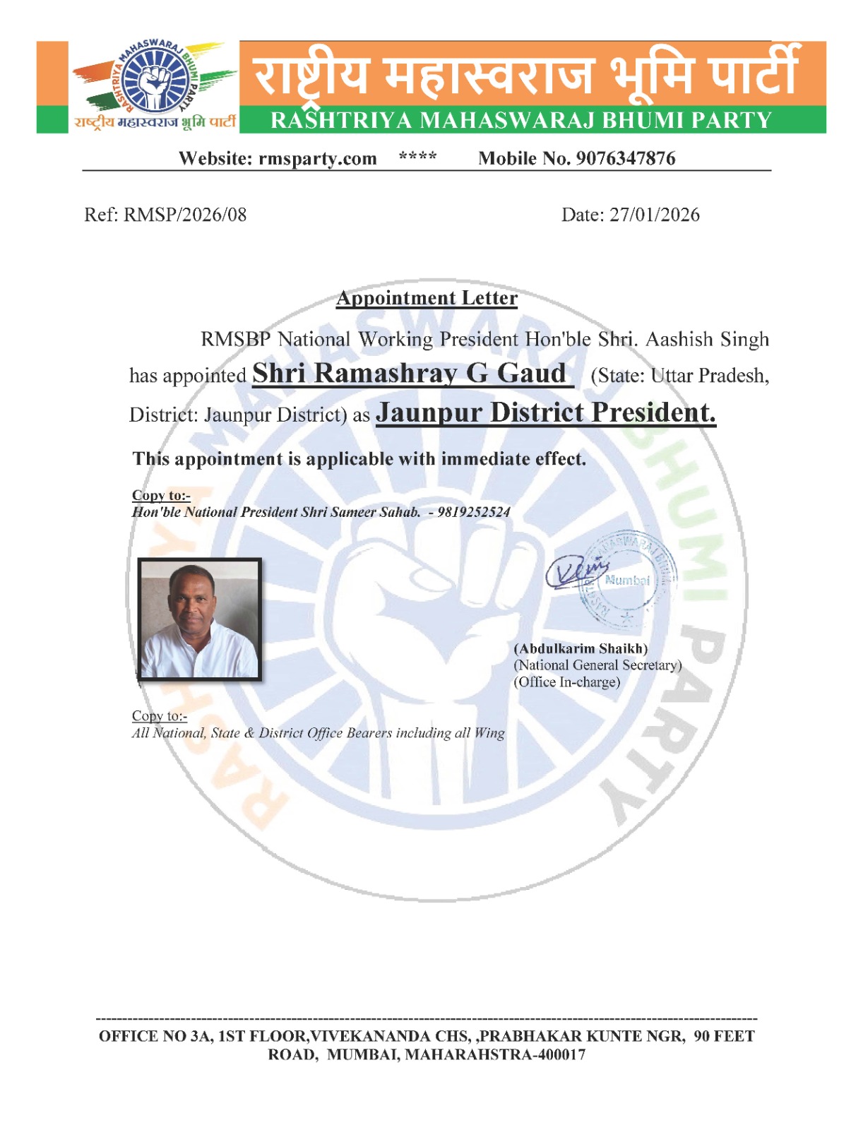 View Allमहास्वराज पार्टी ने उत्तर प्रदेश में संगठन को दी नई मजबूती, रामाश्रय जी गौड़ बने जौनपुर जिला अध्यक्ष