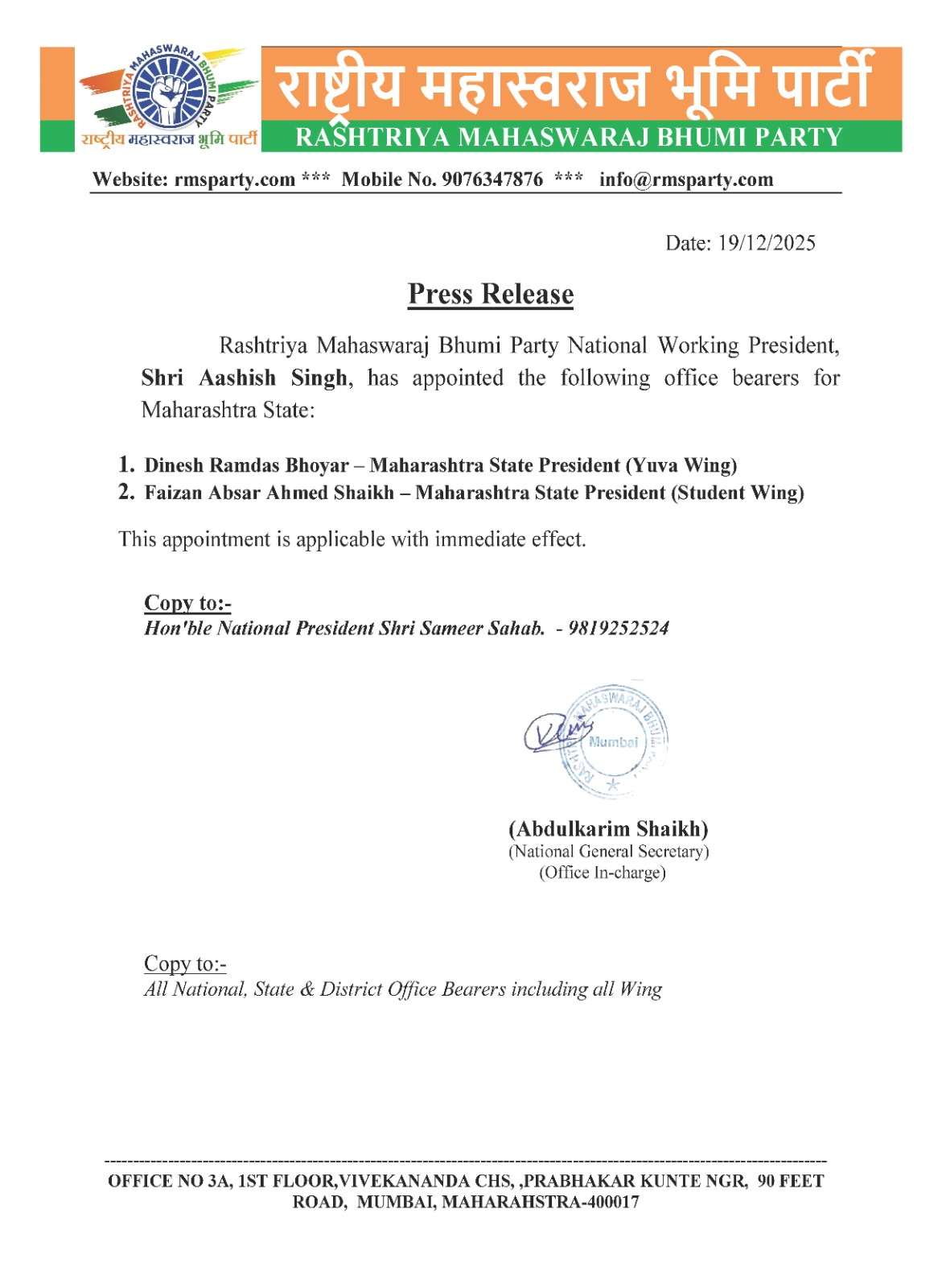 मुस्तफाभाई वहोरा जी को आनंद जिला का पेटलाड तालुका उपाध्यक्ष के रूप में नियुक्त किया गया. RMSBP National President Hon’ble Smt. Vaishali Nitin Gosavi Ji […]