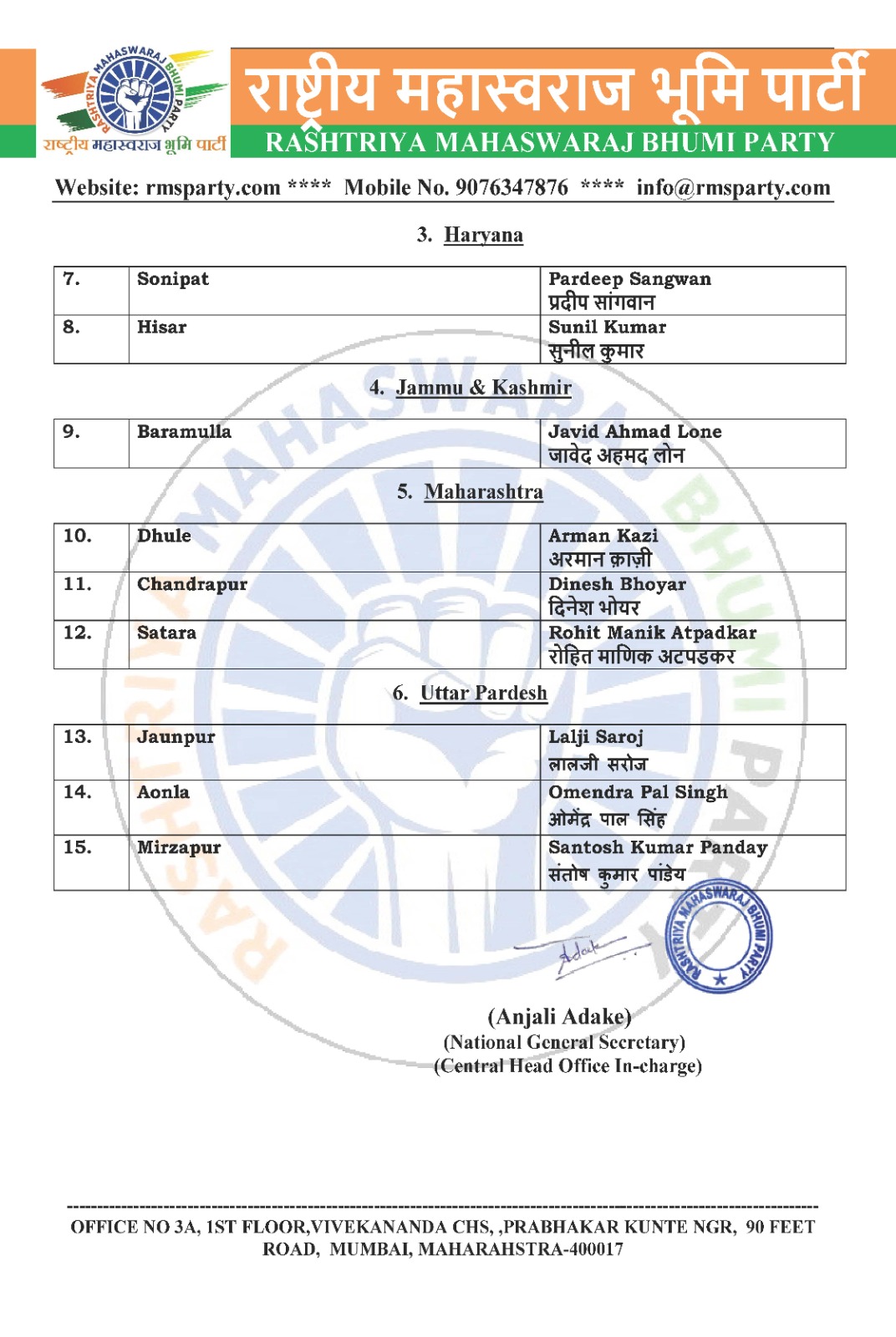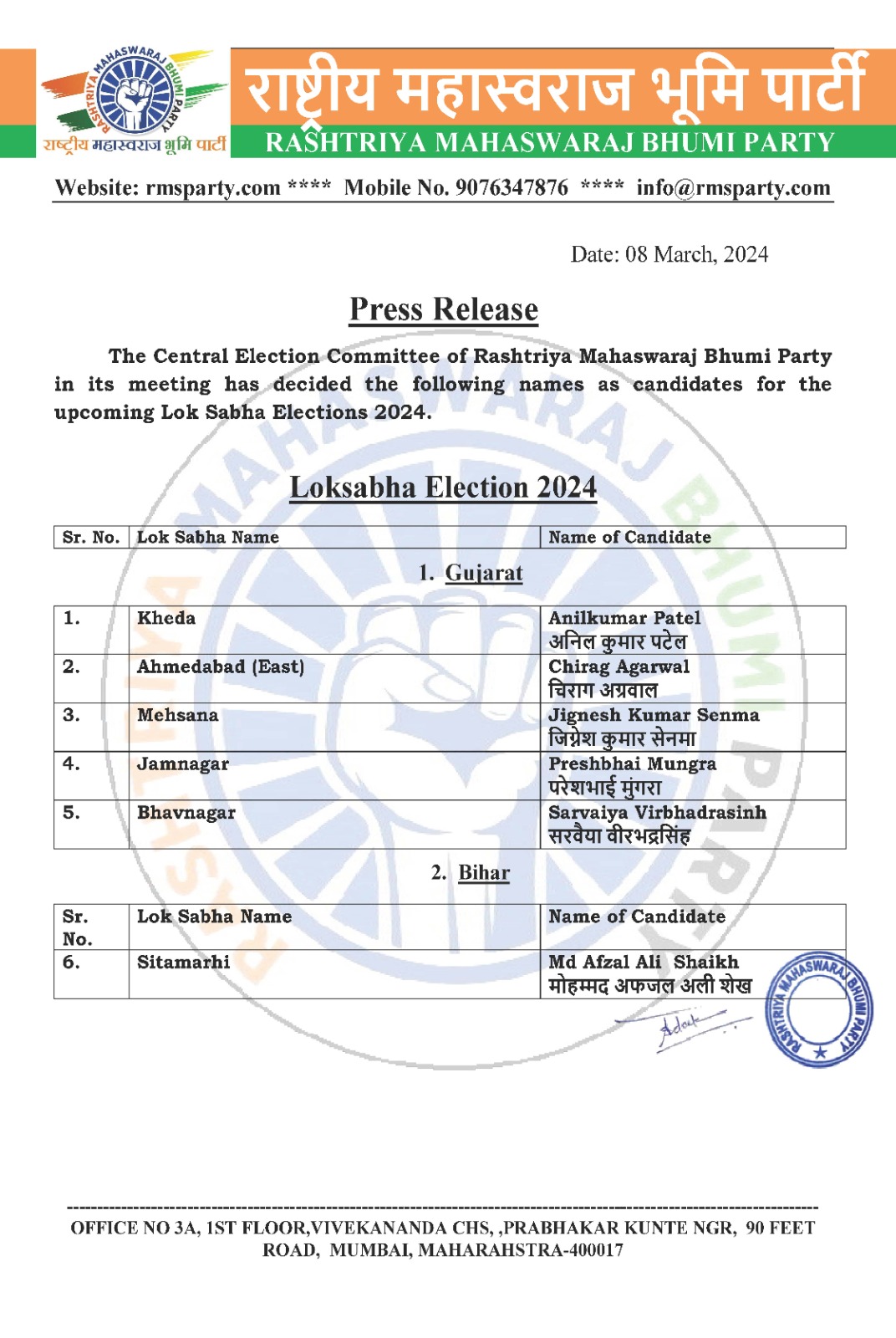 पार्टी के वरिष्ठ नेता श्री आशीष सिंह ने इस मौके पर एक बयान जारी किया, जिसमें उन्होंने कहा, “हमारे उम्मीदवार राष्ट्र के हर वर्ग के नागरिकों को प्रतिनिधित्व करते हैं। वे समाज के विभिन्न मुद्दों को समझते हैं और उन्हें सुलझाने के लिए प्रतिबद्ध हैं। हम उनकी प्रतिभा, नैतिकता और क्षमताओं पर पूरा भरोसा करते हैं और उम्मीद करते हैं कि वे चुनाव मैदान में अपने विचारों को प्रभावी रूप से प्रस्तुत करेंगे।”