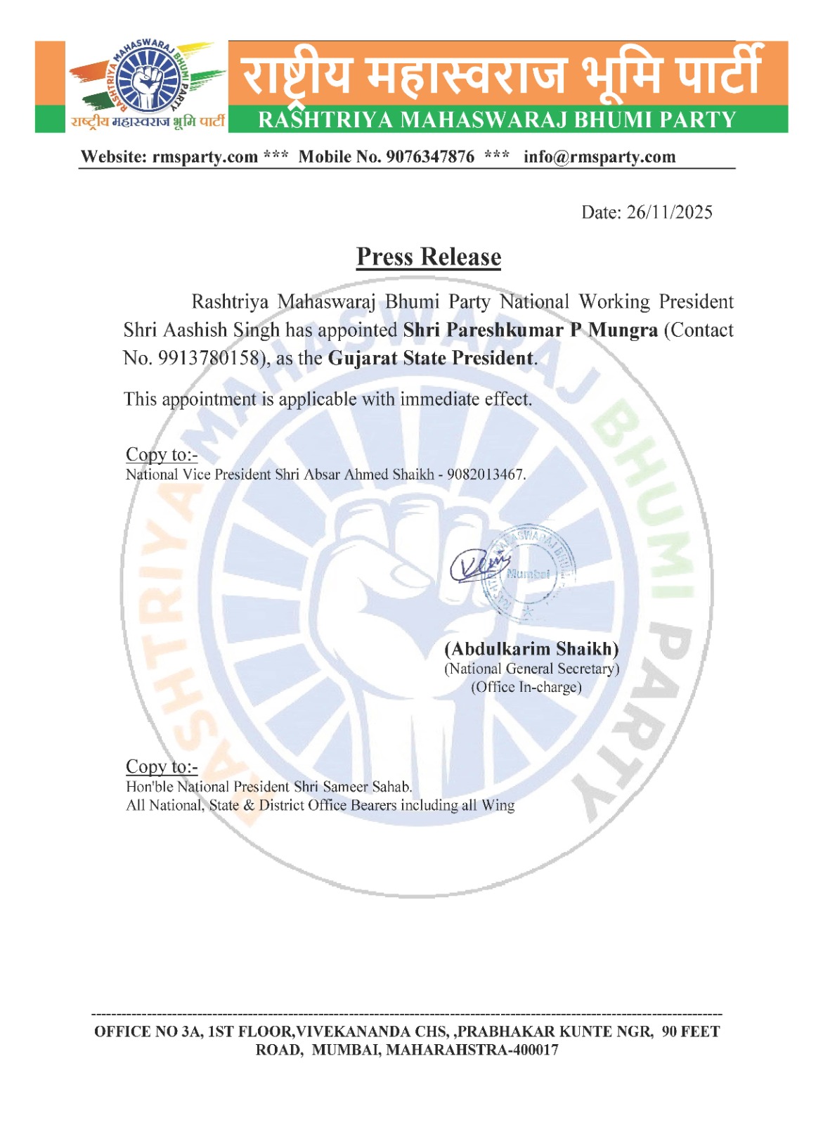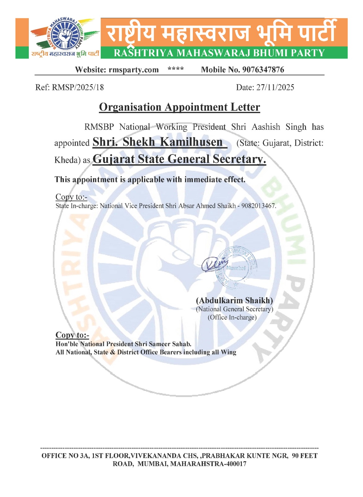 अध्यक्ष: श्री अब्दुलकरीम शेख – राष्ट्रीय सचिव
