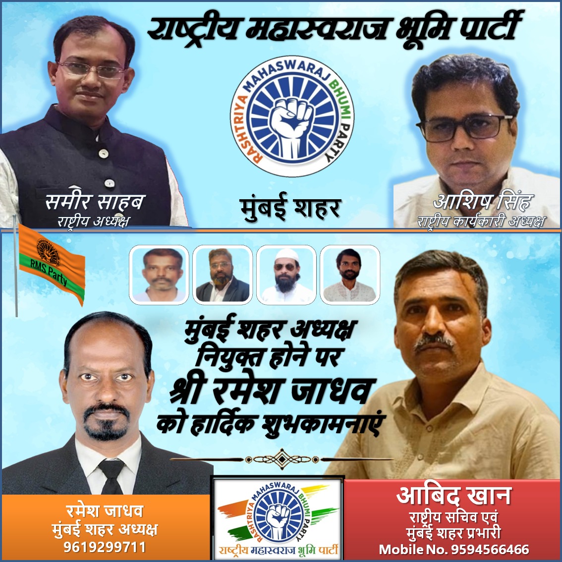 आगामी मुंबई नगर पालिका चुनाव को ध्यान में रखते हुए राष्ट्रीय महास्वराज भूमि पार्टी के राष्ट्रीय कार्याध्यक्ष माननीय श्री आशिष सिंह ने मुंबई सिटी इलेक्शन कमेटी की घोषणा की है।