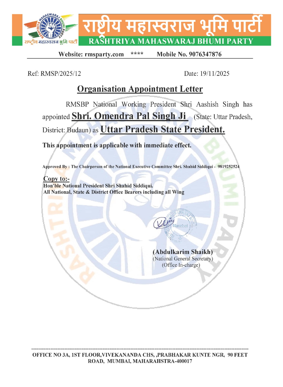 राष्ट्रिय महास्वराज भूमि पार्टी (RMSBP) ने आज संगठनात्मक विस्तार के तहत एक महत्वपूर्ण घोषणा करते हुए श्री ओमेंद्र पाल सिंह जी को उत्तर प्रदेश का State President (राज्य अध्यक्ष) नियुक्त किया है। यह नियुक्ति पार्टी के National Working President श्री आशिष सिंह द्वारा जारी आधिकारिक आदेश के माध्यम से की गई।