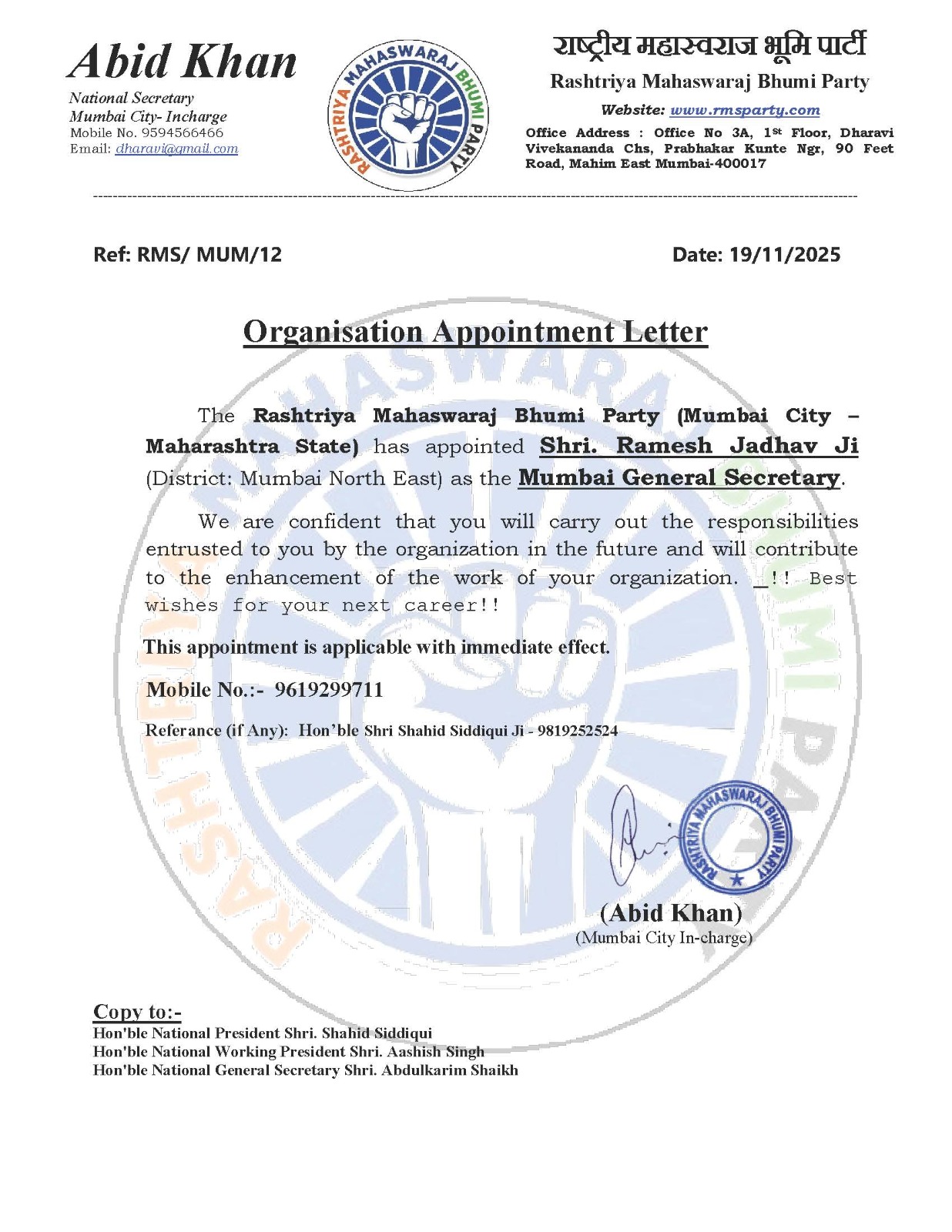 राष्ट्रीय महास्वराज भूमि पार्टी ने मुंबई महानगरपालिका चुनावों से पहले संगठनात्मक मजबूती और जनहित के मुद्दों को प्राथमिकता देते हुए एक महत्वपूर्ण कदम उठाया है। पार्टी के राष्ट्रीय कार्यकारी अध्यक्ष श्री आशीष सिंह ने श्री रमेश जाधव को मुंबई शहर अध्यक्ष नियुक्त किया है। यह नियुक्ति तत्काल प्रभाव से लागू होगी।